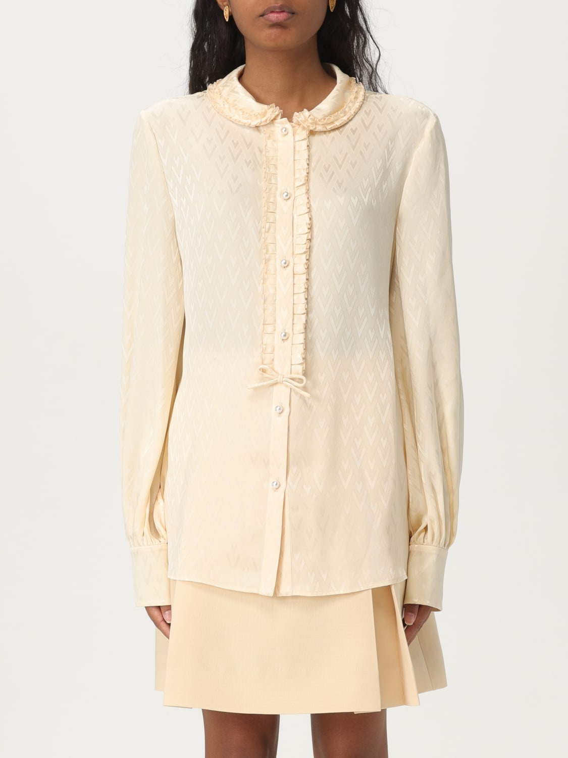 DESCRIPTION - Style: Romantic - Occasion: Evening and party - Logo: VLogo Signature - Details: With ruffles - Neck: Peter Pan - Shoulders: Regular - Closure: With buttons - Bottom: With curved hemline - Sleeves: Long sleeve shirts - Materials: Silk - Pattern: Monogram DETAILS AND CARE Composition 100% SILK SIZE AND FIT Sizes not available Size and fit Regular fit Designer code: 6B0AB7M093L ET5 Giglio Code: G92359 Designer: Valentino Collection: Valentino Woman Category: Clothing Valentino