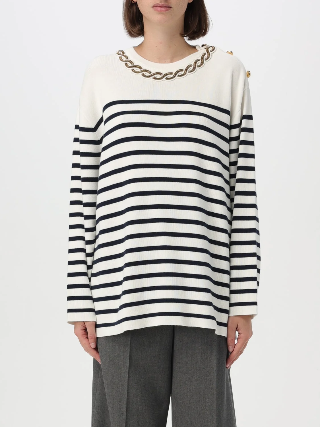 DESCRIPTION - Details: With buttons - Neckline: Crewneck - Shoulders: Relaxed - Sleeves: Long - Bottom: With straight hemline - Materials: Cotton - Pattern: Stripes DETAILS AND CARE Composition not available SIZE AND FIT Sizes not available Size and fit Relaxed fit Designer code: 5B3KC58C8PC 671 Giglio Code: G20253 Designer: Valentino Collection: Valentino Woman Category: Clothing Valentino
