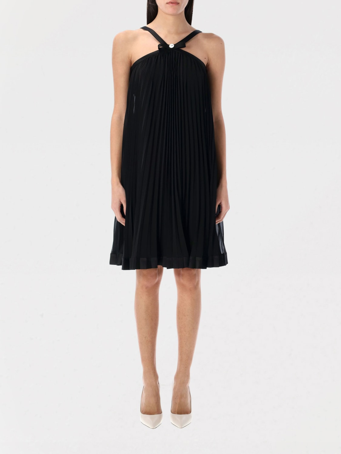 DESCRIPTION - Style: Elegant - Model: Pleated - Neckline: Halter neck - Closure: Back closure with zip - Bottom: With straight hemline - Length: Mini dresses - Occasion: Evening and party dresses - Sleeves: Off-the-shoulder dresses - Materials: Silk blend - Pattern: Plain-colored DETAILS AND CARE Composition 100% polyester Lining 75% acetate 25% silk SIZE AND FIT Sizes not available Size and fit Regular fit Designer code: 10176691A12759 1B000 Giglio Code: G79351 Designer: Versace Collection: Versace Woman Category: Clothing Versace