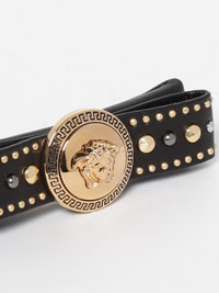 DESCRIPTION - Style: Rock - Logo: Metallic, Versace Medusa - Details: With studs - Closure: With spring clip - Occasion: Special occasions - Materials: Lambskin - Pattern: Embroidery, Logo DETAILS AND CARE Composition Lamb Skin 100%, Brass 100% SIZE AND FIT Sizes not available Designer code: 10122561A16337 1BOOF Giglio Code: H71765 Designer: Versace Collection: Versace Woman Category: Accessories Versace