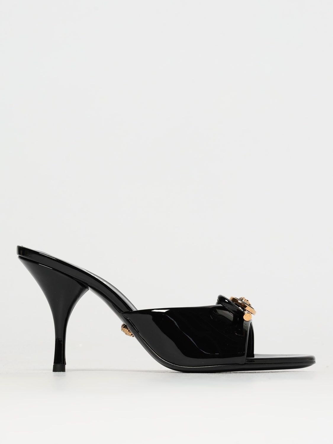 DESCRIPTION - Logo: Metallic, Versace Medusa - Details: With bow - Lining: Leather, With printed logo - Model: Slip on - Toe: Open, Round - Sole: Leather - Materials: Patent leather - Pattern: Bows, All-over logo DETAILS AND CARE Composition 100 AF SIZE AND FIT Sizes Heel: 9 cm Designer code: 1018239 D2VE 1B00V Giglio Code: G68714 Designer: Versace Collection: Versace Woman Category: Shoes Versace
