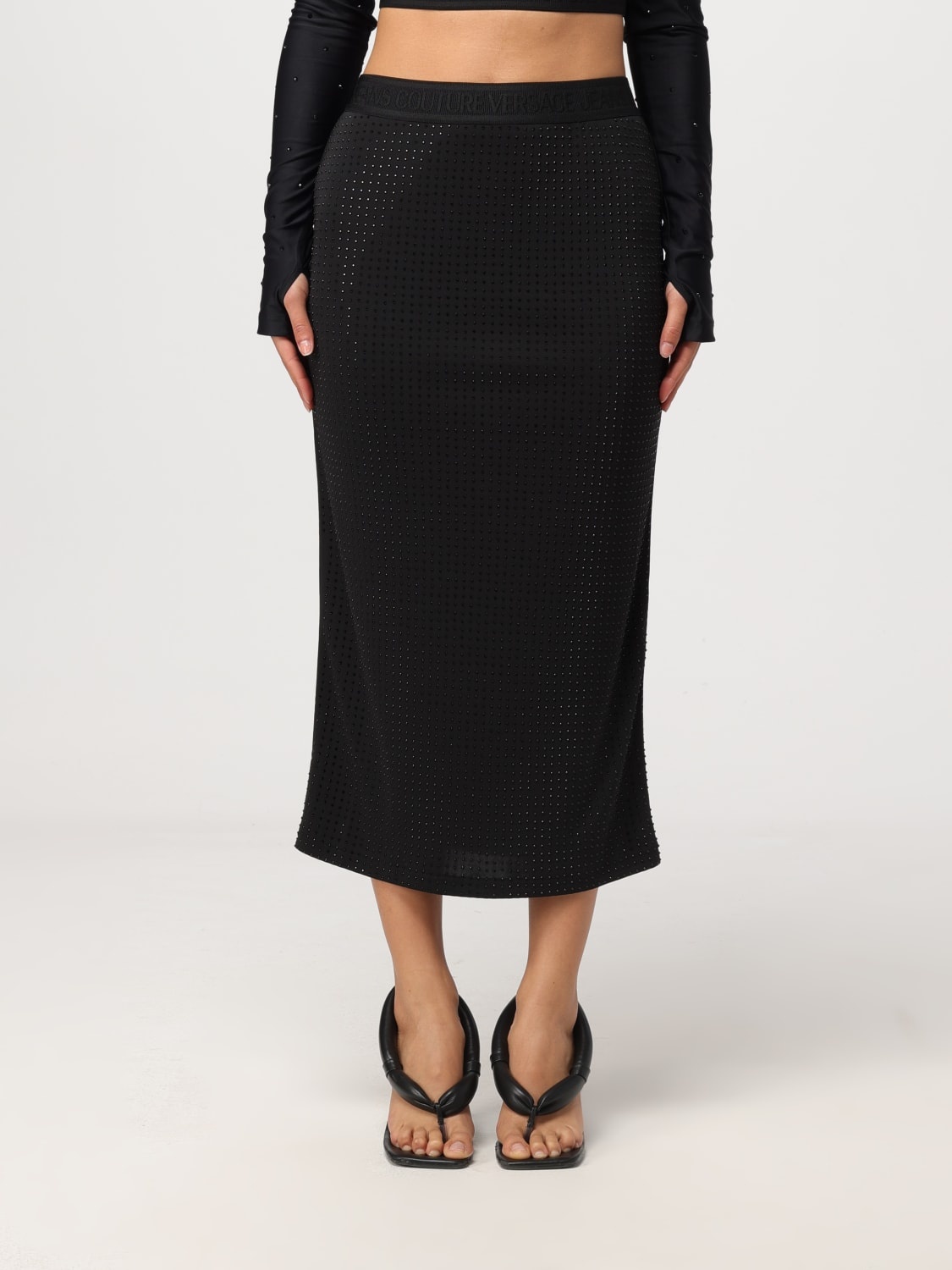 DESCRIPTION - Style: Chic, Glamour - Occasion: Ceremony and cocktail, Evening and party - Details: With rhinestones - Length: Midi - Waist: High , With stretch wristband with logo - Bottom: With straight hemline DETAILS AND CARE Composition POLYESTER SIZE AND FIT Sizes not available Size and fit Slim fit Designer code: 76HAE8B6J0124 899 Giglio Code: F50976 Designer: Versace Jeans Couture Collection: Versace Jeans Couture Woman Category: Clothing Versace Jeans Couture