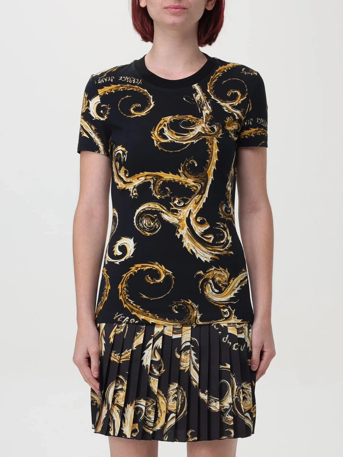 DESCRIPTION - Neckline: Crewneck - Sleeves: Short - Bottom: With straight hemline - Materials: Cotton - Pattern: Baroque Versace DETAILS AND CARE Composition 92%CO 8%EA SIZE AND FIT Sizes not available Size and fit Slim fit Designer code: 77HAH608JS409 G89 Giglio Code: F76519 Designer: Versace Jeans Couture Collection: Versace Jeans Couture Woman Category: Clothing Versace Jeans Couture