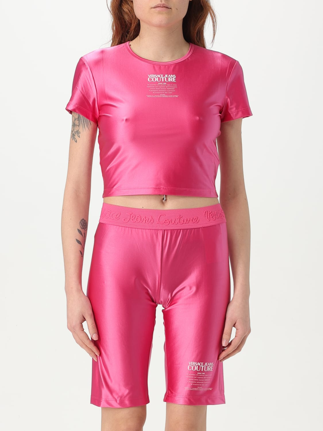 DESCRIPTION - Style: Sporty - Logo: Contrasting - Model: Crewneck - Neckline: Crewneck - Shoulders: Regular - Sleeves: Short - Bottom: With straight hemline - Materials: Stretch cotton - Pattern: Logo DETAILS AND CARE Composition 100% CO SIZE AND FIT Sizes not available Size and fit Cropped fita Designer code: 78HAHT01CJ00T 494 Giglio Code: G77410 Designer: Versace Jeans Couture Collection: Versace Jeans Couture Woman Category: Clothing Versace Jeans Couture