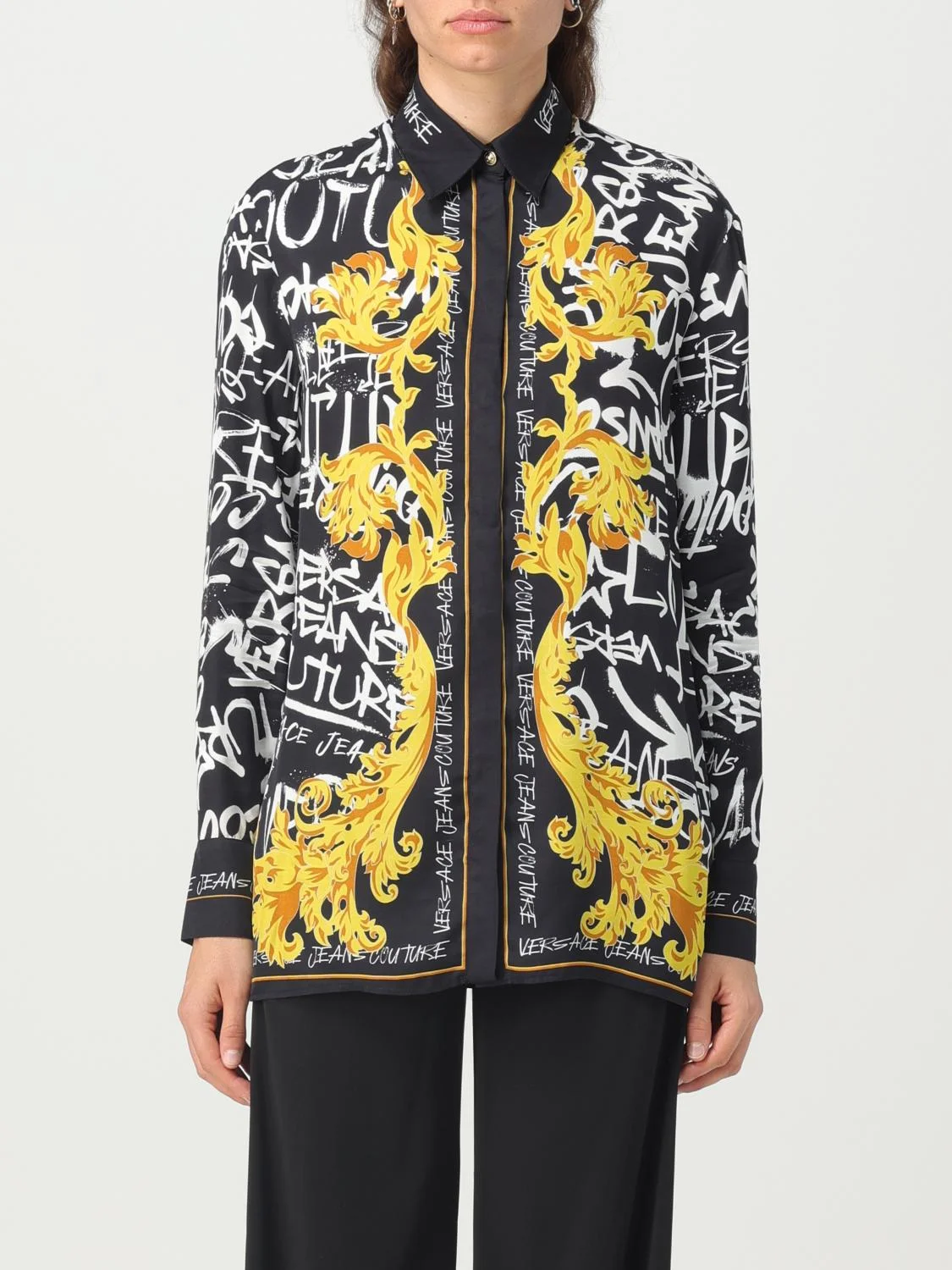 Descrizione - Casual style - Regular fit - Viscose - All-over Baroque Versace print - Classic collar - Regular shoulders - Long sleeves - Cuffs with button - Button closure - Straight hem DETAILS AND CARE Composition 100% viscose SIZE AND FIT Sizes not available Designer code: 75HAL2P2NS314 G89 Giglio Code: E77412 Designer: Versace Jeans Couture Collection: Versace Jeans Couture Woman Category: Clothing Versace Jeans Couture