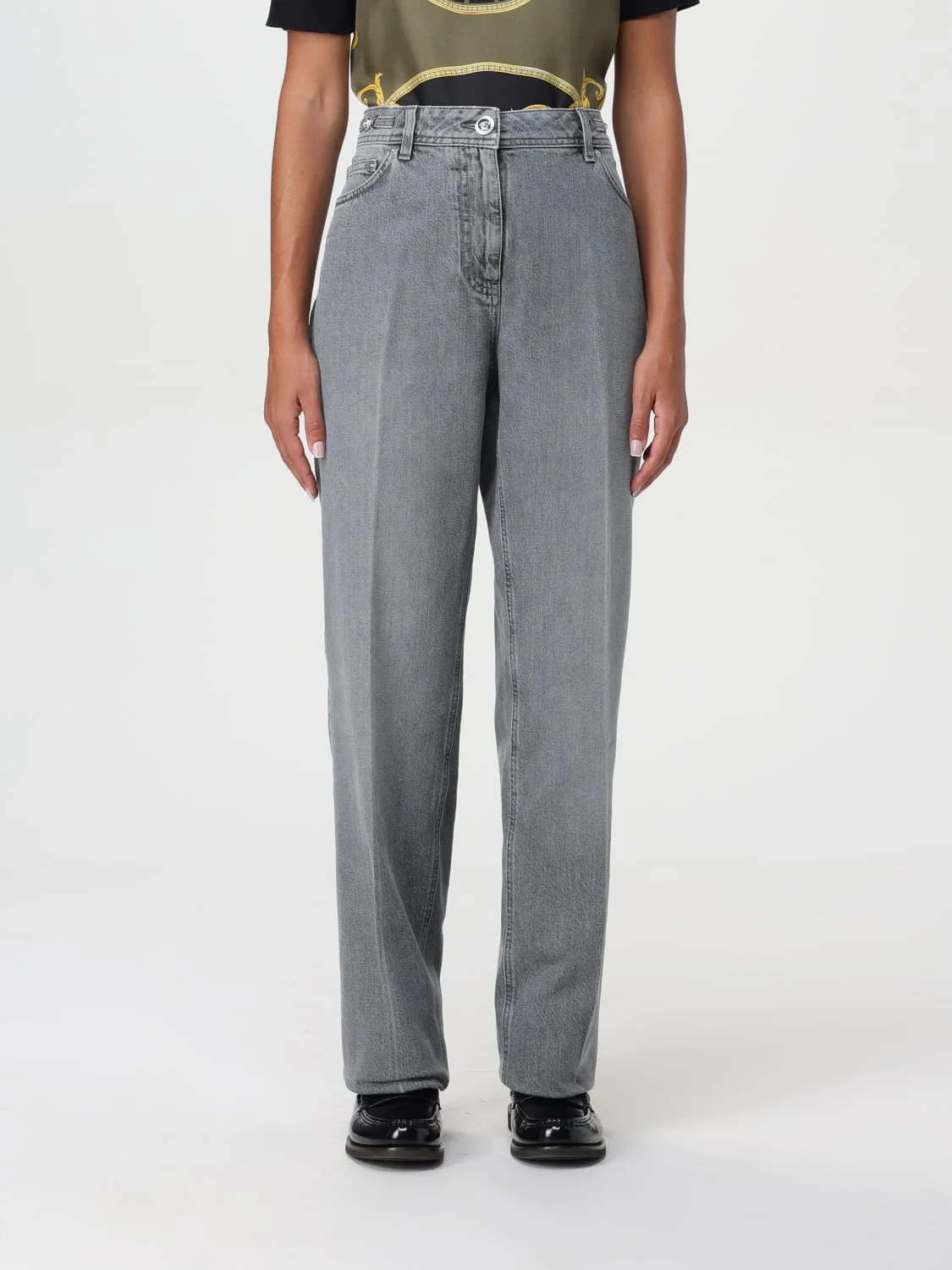 DESCRIPTION - Pockets: 5-pocket - Waist: High , With loops - Bottom: With straight hemline - Logo: With logo - Closure: With button and zip - Materials: Cotton denim - Pattern: Plain-colored DETAILS AND CARE Composition 100% cotton SIZE AND FIT Sizes not available Size and fit Straight Designer code: 10136871A11547 1D280 Giglio Code: F95969 Designer: Versace Collection: Versace Woman Category: Clothing Versace
