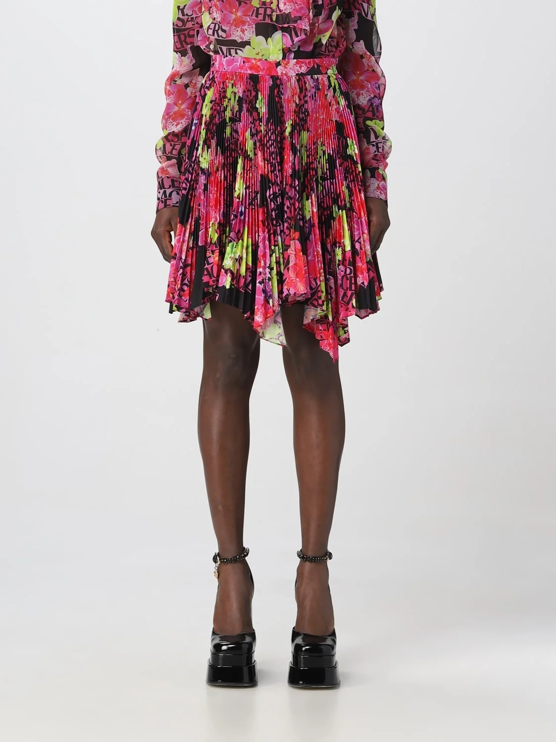 DESCRIPTION - Style: Romantic - Model: Asymmetric, Pleated - Closure: With zip - Waist: High - Bottom: With asymmetric hemline - Length: Mini skirt - Materials: Crepe - Pattern: Floral DETAILS AND CARE Composition not available SIZE AND FIT Sizes not available Size and fit Regular fit Designer code: 10087421A06392 5B100 Giglio Code: D79945 Designer: Versace Collection: Versace Woman Category: Clothing Versace
