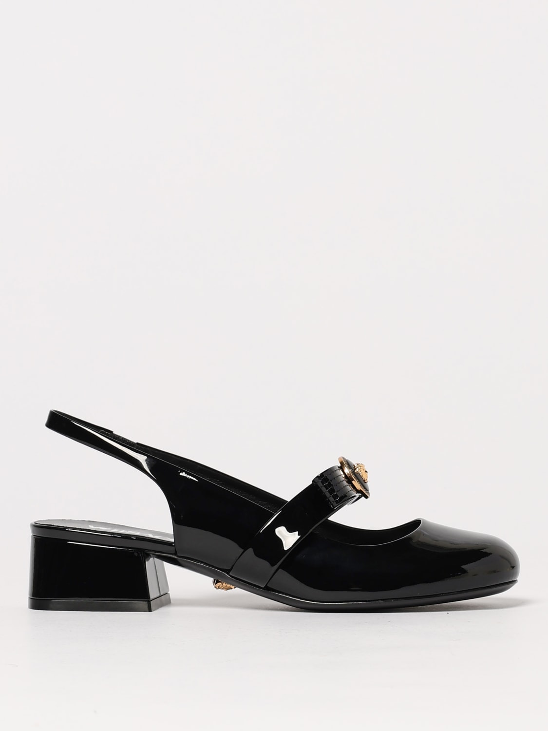 DESCRIPTION - Logo: Versace Medusa - Details: With bow - Lining: With logo - Model: Mary Jane - Toe: Round - Sole: Leather - Heel: Low heel, With stretch strap - Materials: Patent leather - Pattern: Monogram DETAILS AND CARE Composition Furs & Skins->Patent Calf Leather100.0 % Natu SIZE AND FIT Sizes not available Designer code: 1018457D2VE 1B00V Giglio Code: G65490 Designer: Versace Collection: Versace Woman Category: Shoes Versace