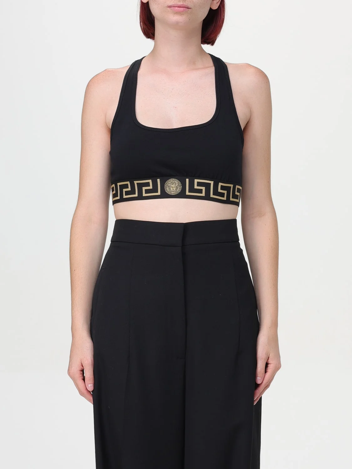 DESCRIPTION - Model: Bandeau - Neckline: Olympic neckline, Squared - Sleeves: Sleeveless - Logo: Versace Medusa - Materials: Stretch cotton - Pattern: Plain-colored DETAILS AND CARE Composition GENERAL COTTON 96 - GENERAL ELASTANE 4 - SIZE AND FIT Sizes not available Size and fit Cropped fita , Slim fit Designer code: AUD010391A10011 A1008 Giglio Code: F76117 Designer: Versace Collection: Versace Woman Category: Clothing Versace