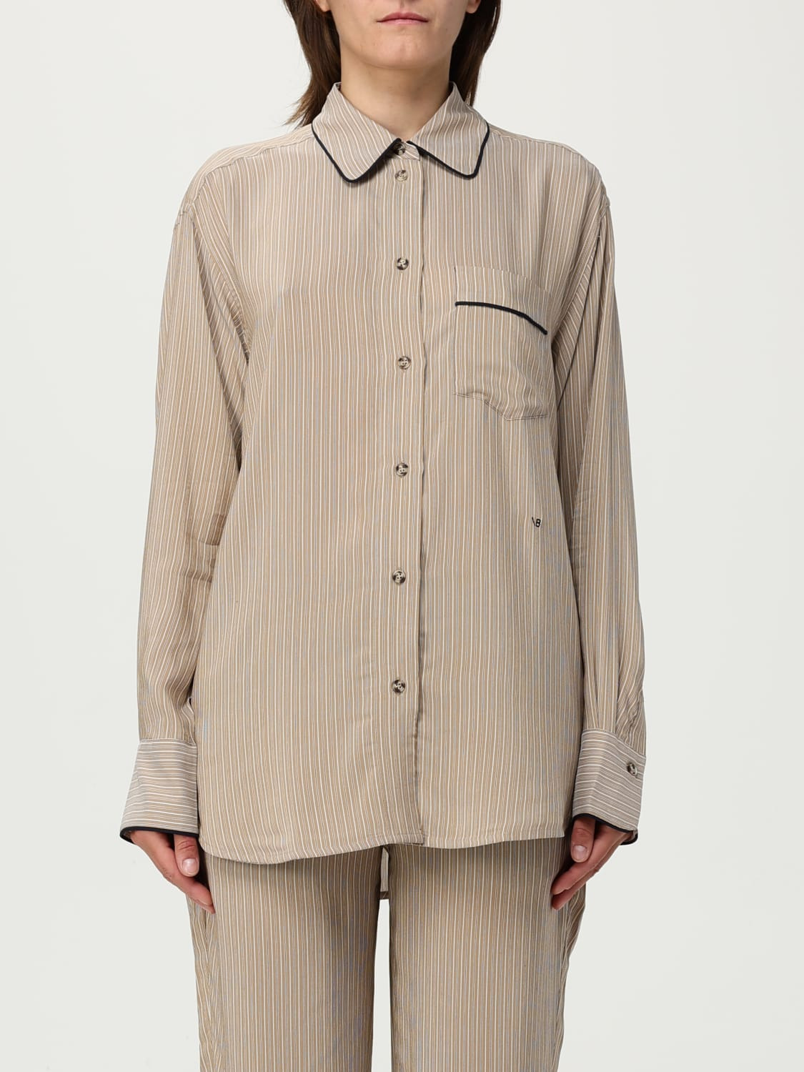 DESCRIPTION - Style: Classic - Neck: Classic - Shoulders: Relaxed - Closure: With buttons - Pockets: Patch pocket - Bottom: With curved hemline - Sleeves: Long sleeve shirts - Materials: Silk blend - Pattern: Stripes DETAILS AND CARE Composition 70% viscose, 30% silk SIZE AND FIT Sizes not available Size and fit Relaxed fit Designer code: 1125WSH006013A TOBACCOMIDNIGHT Giglio Code: G96913 Designer: Victoria Victoria Beckham Collection: Victoria Victoria Beckham Woman Category: Clothing Victoria Victoria Beckham