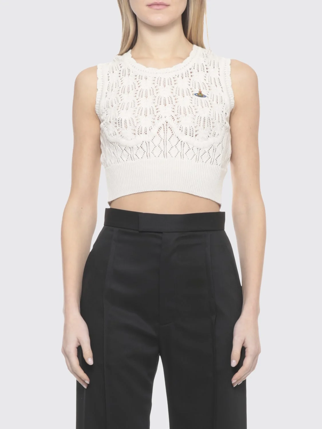 DESCRIPTION - Style: Contemporary - Logo: Contrasting, Embroidered, Vivienne Westwood Orb - Neckline: Crewneck - Shoulders: Regular - Bottom: With straight hemline - Model: Crochet , Knit - Sleeves: Off-the-shoulder tops - Materials: Cotton - Pattern: Logo, Plain-colored DETAILS AND CARE Composition 100% Cotton SIZE AND FIT Sizes not available Size and fit Cropped fita , Slim fit Designer code: 1803007RY004S A408 Giglio Code: I19536 Designer: Vivienne Westwood Collection: Clothing Vivienne Westwood Category: Clothing > Top