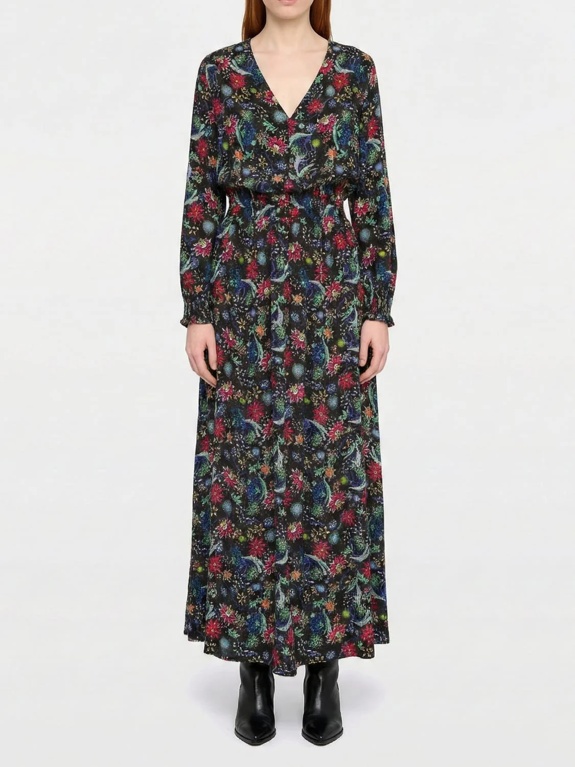 DESCRIPTION - Style: Bohemien, Vintage - Neckline: V neckline - Shoulders: Regular - Waist: Stretch - Bottom: With straight hemline - Length: Long dresses - Occasion: Morning dresses - Sleeves: Long sleeve dresses - Materials: Viscose - Pattern: Floral DETAILS AND CARE Composition 100 AF SIZE AND FIT Sizes not available Size and fit Regular fit Designer code: WWDR02619 404 Giglio Code: 439716 Designer: Zadig & Voltaire Collection: Zadig & Voltaire Woman Category: Clothing Zadig & Voltaire
