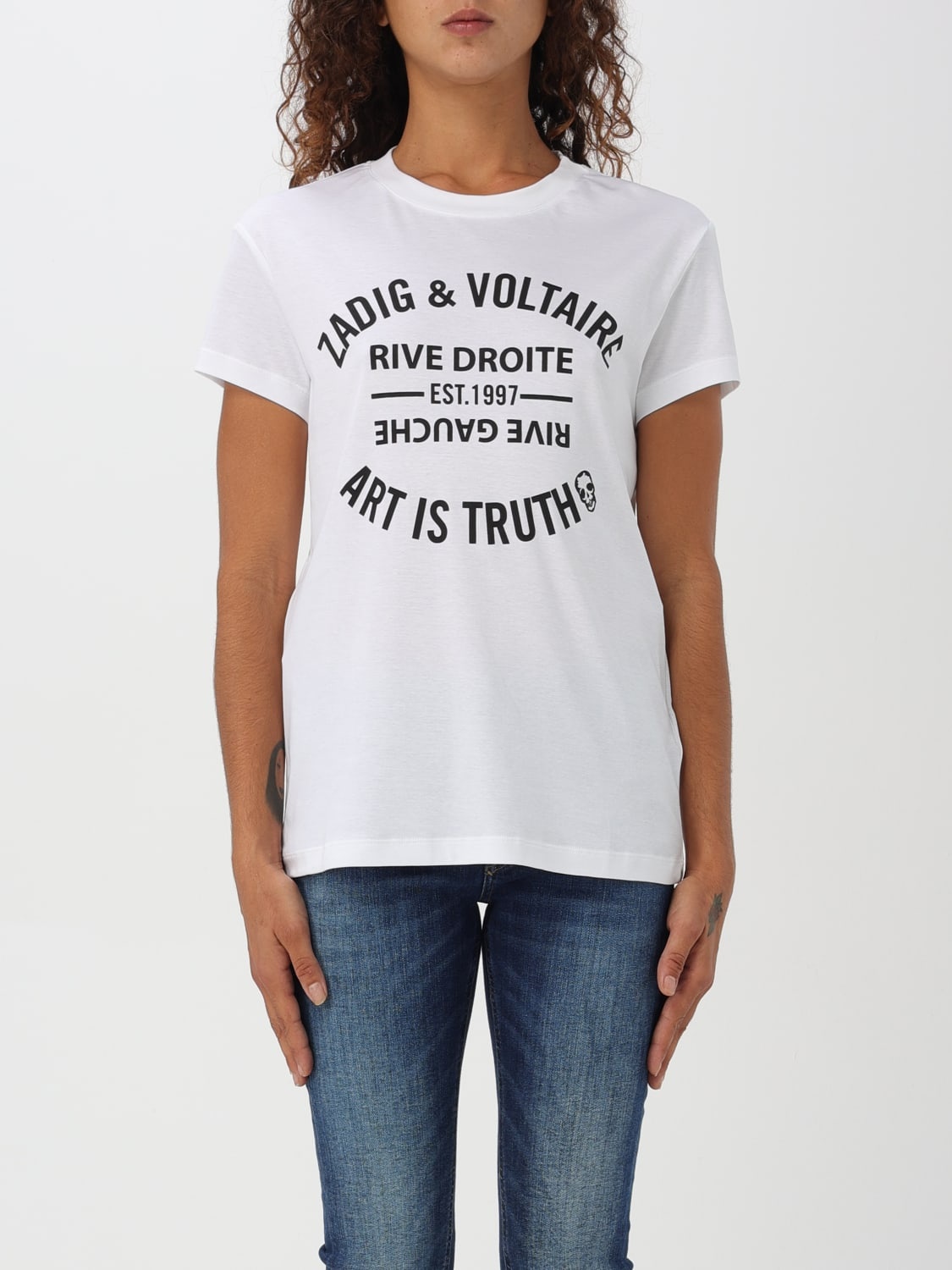 DESCRIPTION - Logo: Contrasting - Neckline: Crewneck - Shoulders: Regular - Sleeves: Short - Bottom: With straight hemline - Materials: Cotton - Pattern: Plain-colored DETAILS AND CARE Composition GENERAL COTTON 100 - SIZE AND FIT Sizes not available Size and fit Regular fit Designer code: JWTS02769 101 Giglio Code: G08608 Designer: Zadig & Voltaire Collection: Zadig & Voltaire Woman Category: Clothing Zadig & Voltaire