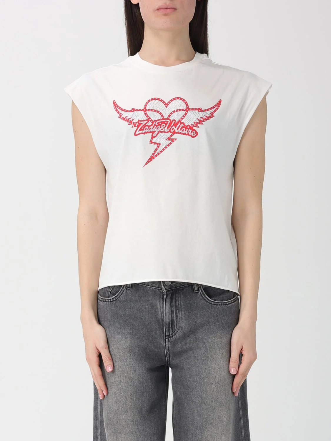 DESCRIPTION - Style: Rock - Logo: Contrasting - Details: With rhinestones - Model: Crewneck - Neckline: Crewneck - Sleeves: Sleeveless - Bottom: With straight hemline - Materials: Cotton - Pattern: Hearts, Slogan DETAILS AND CARE Composition 100 AF SIZE AND FIT Sizes not available Size and fit Slim fit Designer code: JWTT01280 103 Giglio Code: 439712 Designer: Zadig & Voltaire Collection: Zadig & Voltaire Woman Category: Clothing Zadig & Voltaire
