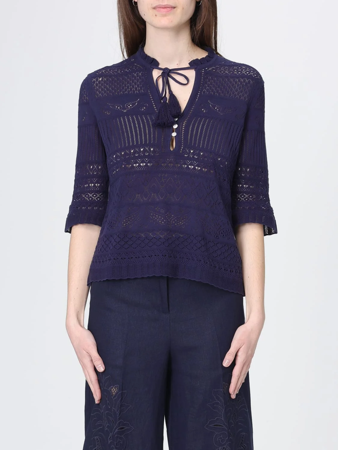 DESCRIPTION - Style: Ethnic, Vintage - Sustainable: Organic - Neckline: V neckline - Shoulders: Regular - Closure: With bands to tie - Bottom: With ribbed edges - Occasion: Morning - Model: Knit, Pierced - Sleeves: Short sleeve tops - Materials: Cotton - Pattern: Plain-colored DETAILS AND CARE Composition 100% of fibers comes from organic agriculture Wash and Care Wash at a max temperature of 30°C SIZE AND FIT Sizes not available Size and fit Regular fit Designer code: KWTO01138 430 Giglio Code: I11638 Designer: Zadig & Voltaire Collection: Clothing Zadig & Voltaire Category: Clothing > Top