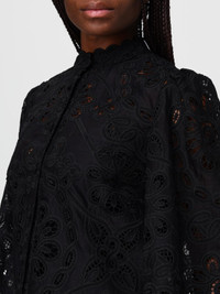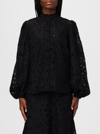 DESCRIPTION - Style: Bohemien, Romantic - Neck: Mandarin collar - Shoulders: Regular - Sleeves: Long sleeve shirts - Closure: Concealed, With buttons - Bottom: With straight hemline - Materials: Sangallo - Pattern: Plain-colored DETAILS AND CARE Composition 100% POLYESTER SIZE AND FIT Sizes not available Size and fit Regular fit Designer code: 4253TSS251 BLK Giglio Code: H13620 Designer: Zimmermann Collection: Zimmermann Woman Category: Clothing Zimmermann