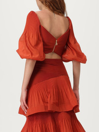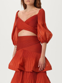DESCRIPTION - Style: Romantic - Neckline: V neckline - Shoulders: Regular - Sleeves: Long sleeve tops - Closure: Back closure with zip - Bottom: With straight hemline - Materials: Crepe - Pattern: Plain-colored DETAILS AND CARE Composition not available SIZE AND FIT Sizes not available Size and fit Regular fit Designer code: 3915TS25R DKRD Giglio Code: G74289 Designer: Zimmermann Collection: Zimmermann Woman Category: Clothing Zimmermann