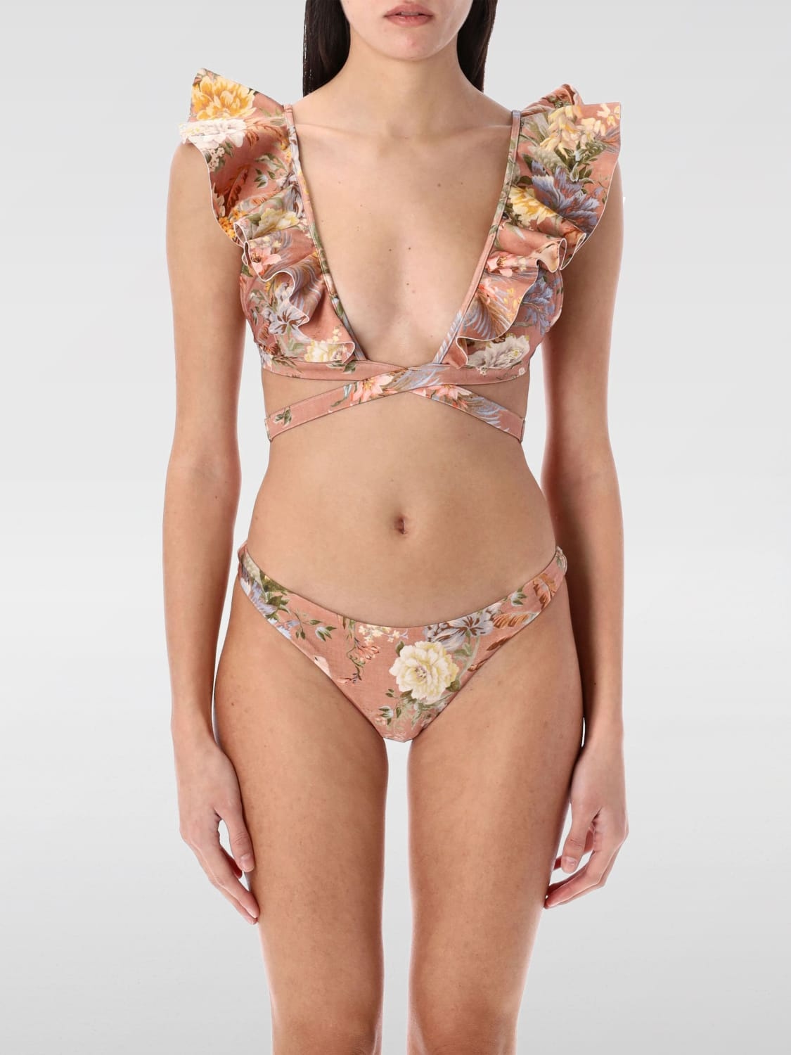 DESCRIPTION - Style: Romantic - Occasion: Beach - Logo: Contrasting - Model: Brief, Bikini - Neckline: Deep V - Shoulders: With adjustable shoulder pads - Closure: With bands to tie - Waist: Low - Materials: Polyamide - Pattern: Floral DETAILS AND CARE Composition GENERAL POLYAMIDE 80 - GENERAL ELASTANE 20 - SIZE AND FIT Sizes not available Size and fit Slim fit Designer code: 2505WRS253 TRPOASPNK Giglio Code: G42689 Designer: Zimmermann Collection: Zimmermann Woman Category: Clothing Zimmermann