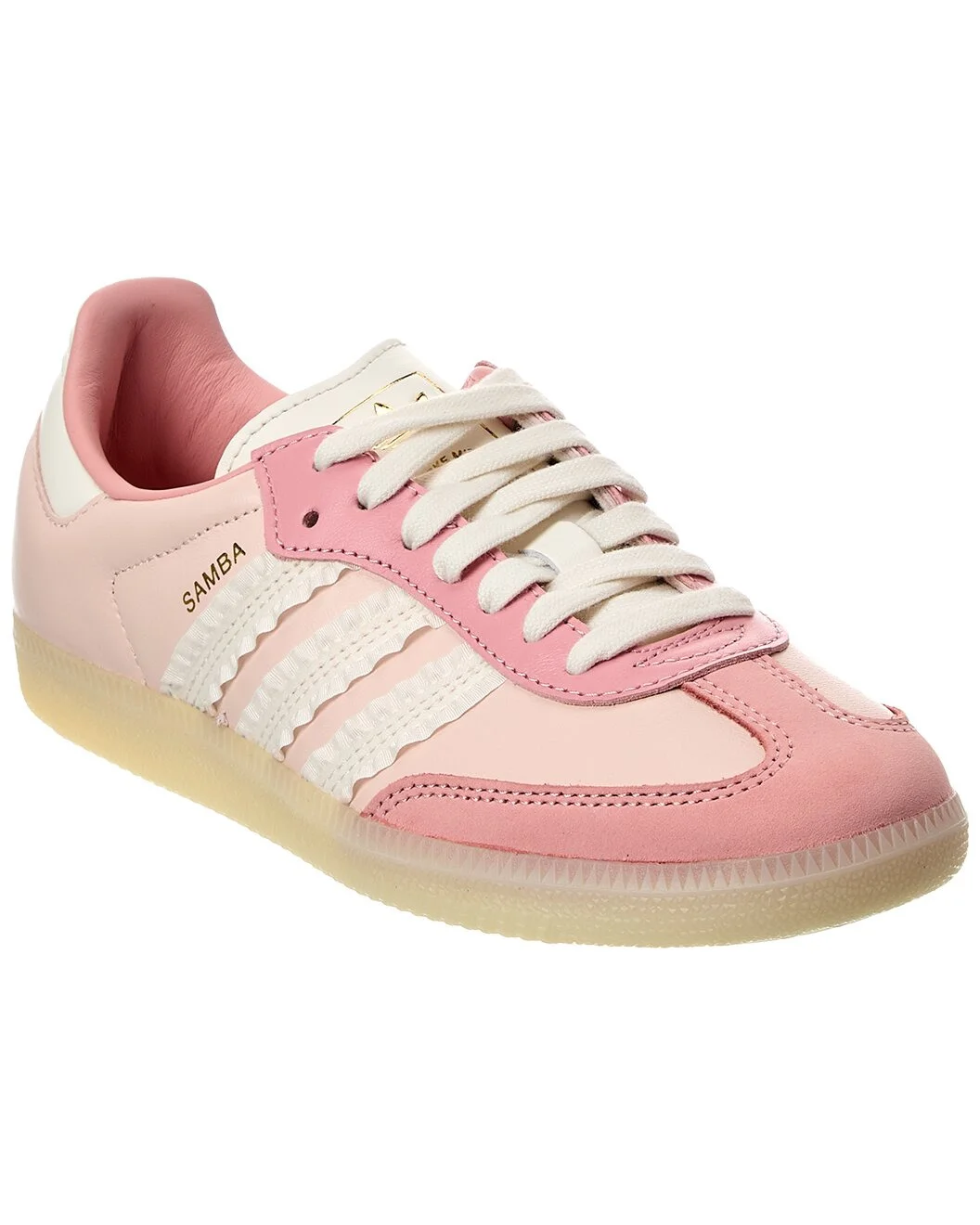 - About the brand: Innovative athletic wear for every sport. - Samba OG Leather Sneaker in wonder quartz/off white/wonder mauve leather with logo accents and ruffled stripes - Lace-up closure - Moderately padded footbed - Rubber sole with traction - Imported