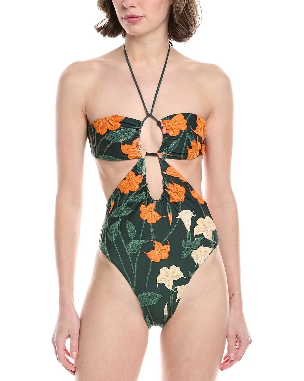 - Color/pattern: mejorana - Design details: self-tie halter neck, cutout design, embroidered design and bead embellishments - Self-tie closure - Moderate seat coverage - 81% recycled polyester, 19% elastane - Lining: 86% polyester, 14% elastane - Hand wash - Imported