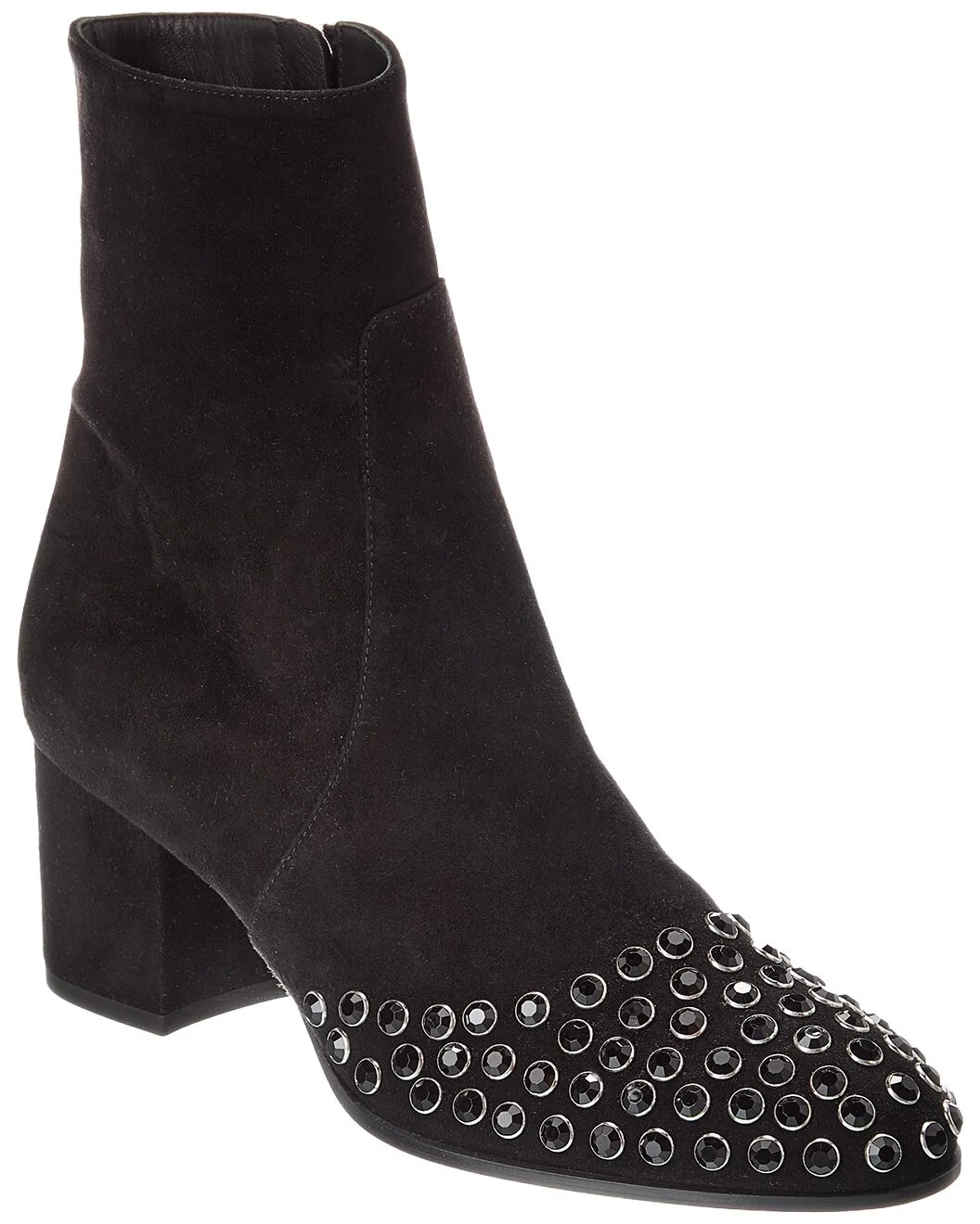 - About the brand: The epitome of elegance in women's wear. - Please note: Size selections are European. For US conversions, please reference size chart. - Made in Italy - Color/material: black suede - Design details: silver-tone hardware, embellished toe - Inner side zip-up closure - Lightly padded leather insole - Smooth leather sole - 2.5in heel - 6.5in shaft - 10in boot circumference - Please note: All measurements are approximate and were taken from a size 37; slight variations may occur. - The Boot Size Guide