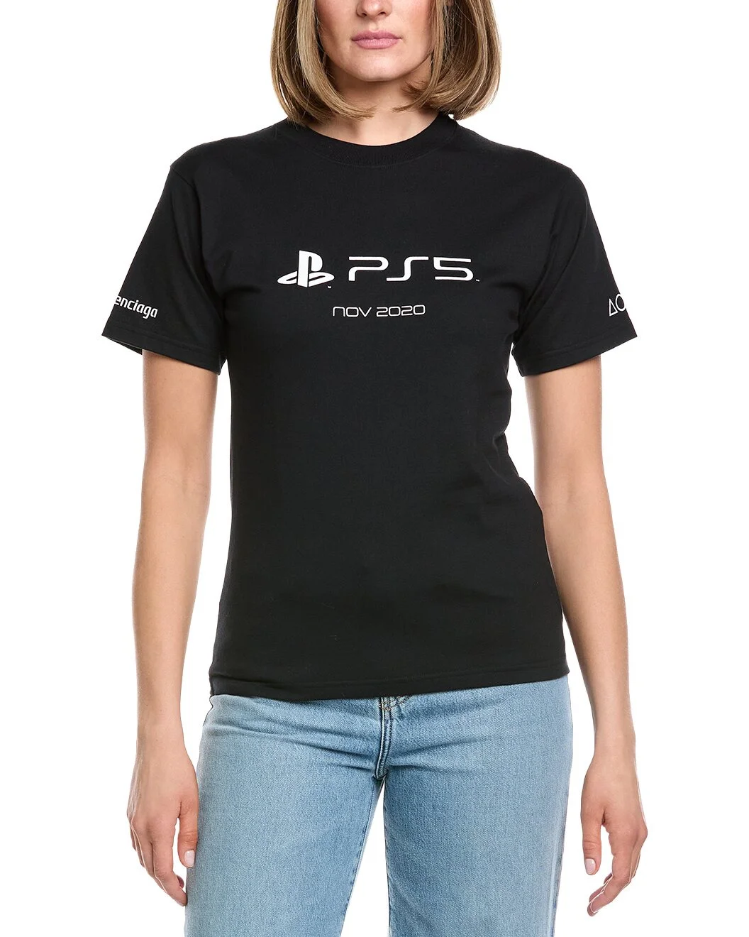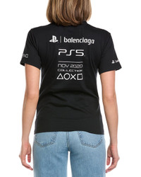 - About the brand: Recognized as one of the most influential names in fashion, Balenciaga has a reputation of uncompromising standards. Unmistakable, ultra-modern shapes and high-concept collections set Balenciaga apart, from runway to ready-to-wear. High-end collaborations and a renewed focus on fine-crafted handbags and footwear earn the brand a coveted spot as a viral, celebrity favorite. - Sony T-Shirt in black with crewneck, and ribbed trim - Approximately 24in from shoulder to hem - Model is 5'10.5 and is wearing a size small. Measurements may vary slightly by size. - Slip-on styling - 100% cotton - Machine wash