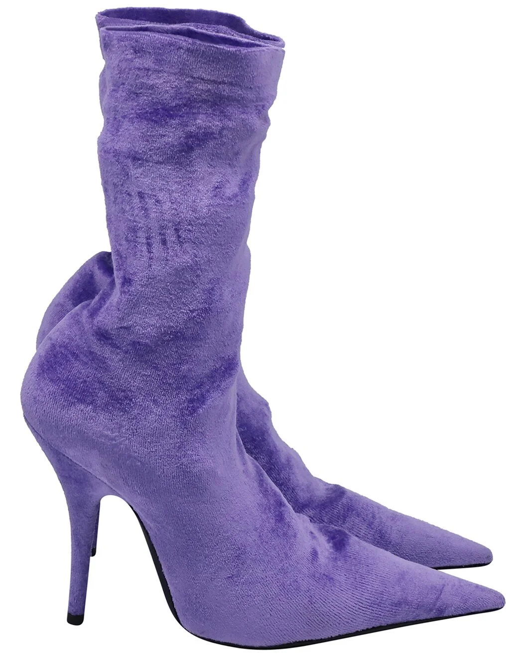 - About the brand: Recognized as one of the most influential names in fashion, Balenciaga has a reputation of uncompromising standards. Unmistakable, ultra-modern shapes and high-concept collections set Balenciaga apart, from runway to ready-to-wear. High-end collaborations and a renewed focus on fine-crafted handbags and footwear earn the brand a coveted spot as a viral, celebrity favorite. - This is an authentic, pre-loved piece. This item is in very good condition and shows light signs of wear. This item shows lightly used but very well maintained, may show minor signs of wear, scratches , worn corners, minor interior wear. - For more information on condition, please see our condition guide at the bottom - Color/material: purple velvet - Design details: The Balenciaga Knife Sock Mid-Calf Boots in purple velvet make a daring statement with their sculptural pointed toe and second-skin fit. Crafted in plush velvet, these boots fuse couture-like elegance with a bold, contemporary silhouette. Styling tip: Let them shine by pairing with a sleek black mini dress or oversized blazer for a high-impact, fashion-forward look. - 4.33in heel - 10.2in insole length - Please note: All measurements were taken by hand and are approximate; slight variations may occur. - Available only in Women's size EU - 36 - The Pre-Loved Condition Guide - Our products are 100% genuine. In some cases we purchase merchandise from trusted independent suppliers and not directly from the brand owner. In all cases we stand by the authenticity of every product sold on our site.