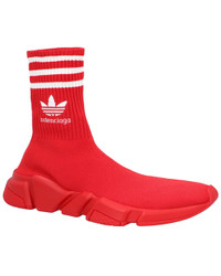 - About the brand: Recognized as one of the most influential names in fashion, Balenciaga has a reputation of uncompromising standards. Unmistakable, ultra-modern shapes and high-concept collections set Balenciaga apart, from runway to ready-to-wear. High-end collaborations and a renewed focus on fine-crafted handbags and footwear earn the brand a coveted spot as a viral, celebrity favorite. - Please note: Size selections are European. For US conversions, please reference size chart. - Made in Italy - x adidas Speed High-Top Sneaker in red fabric with signature Trefoil and 3-Stripes logo, knitted construction, sock-style ankle - Smooth insole - Rubber sole - 1.77in heel - 0.78in platform - 6.69in shaft - Please note: All measurements are approximate and were taken from a size 41; slight variations may occur. - Our products are 100% genuine.  In some cases we purchase merchandise from trusted independent suppliers and not directly from the brand owner.  In all cases we stand by the authenticity of every product sold on our site.