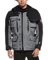 - Color/pattern: light grey/black - Model is 6'1 and is wearing a size S. Measurements may vary slightly by size. - Design details: removable hood, built-on shoulder and arm guards, zipper cuffs, zippered mesh vents all around, dual chest pockets, front patch pockets, back pocket - Zipper and snap closure - Shell: 100% nylon - Lining: 100% polyester - Machine wash - Imported - The Men's Size Guide