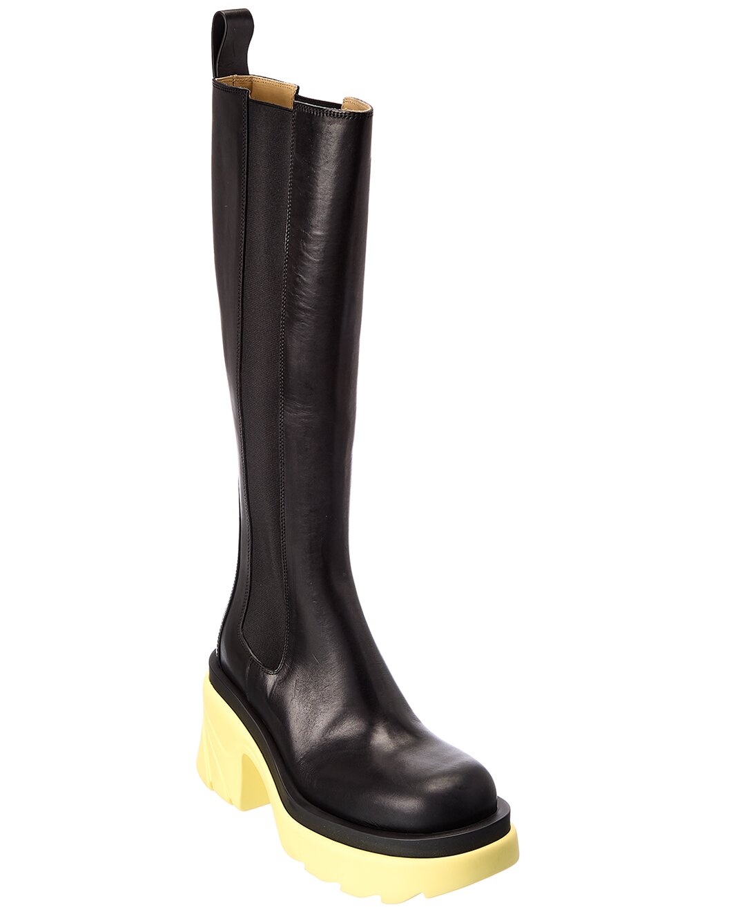 - About the brand: Unsurpassed craftsmanship - and that signature woven leather. - Please note: Size selections are European. For US conversions, please reference size chart. - Made in Italy - Flash Leather Bootie in black/yellow leather with elasticized gores at sides and pull-on tab at back - Lightly padded leather insole - Rubber lug sole - 3.75in heel - 1.5in platform - 12in shaft - 10in boot circumference - Please note: All measurements are approximate and were taken from a size 37; slight variations may occur. - Our products are 100% genuine. In some cases we purchase merchandise from trusted independent suppliers and not directly from the brand owner. In all cases we stand by the authenticity of every product sold on our site. - The Boot Size Guide