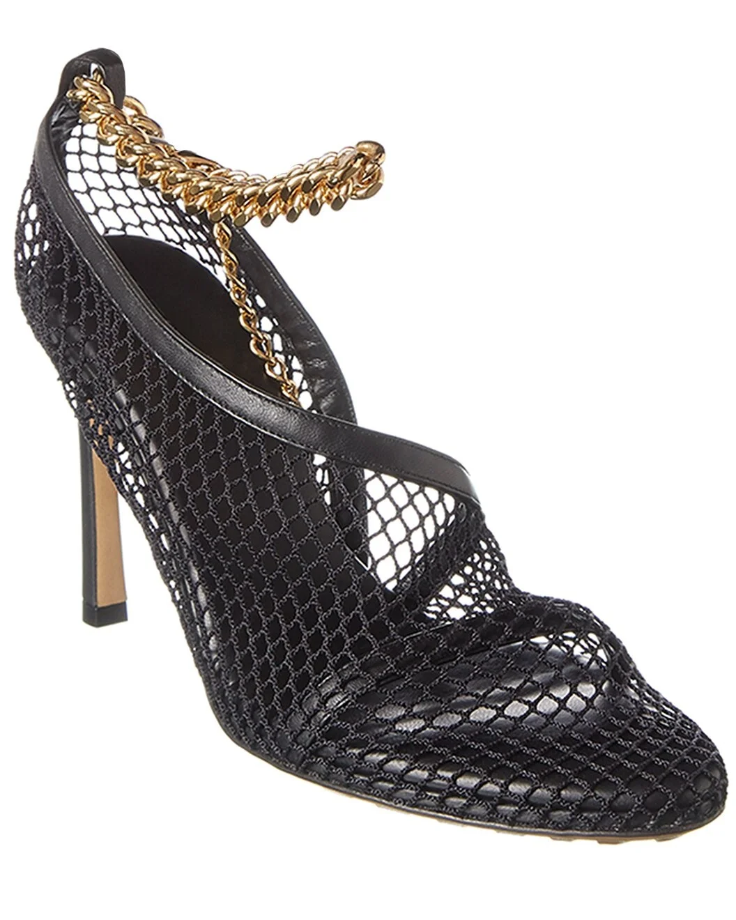 - About the brand: Unsurpassed craftsmanship - and that signature woven leather. - Please note: Size selections are European. For US conversions, please reference size chart. - Made in Italy - Color/material: black leather and mesh fabric - Design details: gold-tone hardware, chain ankle strap - Lightly padded leather insole - Smooth leather sole - 3.9in heel - Please note: All measurements are approximate and were taken from a size 36.5; slight variations may occur. - Our products are 100% genuine. In some cases we purchase merchandise from trusted independent suppliers and not directly from the brand owner. In all cases we stand by the authenticity of every product sold on our site.