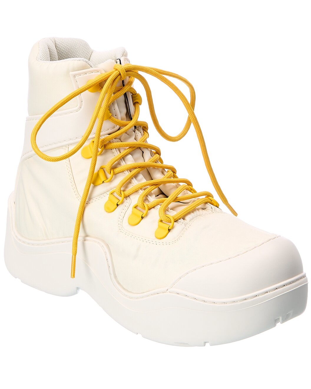 - About the brand: Unsurpassed craftsmanship - and that signature woven leather. - Please note: Size selections are European. For US conversions, please reference size chart. - Made in Italy - The Puddle Bomber Rubber Boot in white textile and rubber with contrast laces - Lace-up closure - Lightly padded insole - Rubber sole with traction - 2.5in heel - 1.5in platform - 5.5in shaft - 11in boot circumference - Please note: All measurements are approximate and were taken from a size 37; slight variations may occur. - Our products are 100% genuine. In some cases we purchase merchandise from trusted independent suppliers and not directly from the brand owner. In all cases we stand by the authenticity of every product sold on our site. - The Boot Size Guide