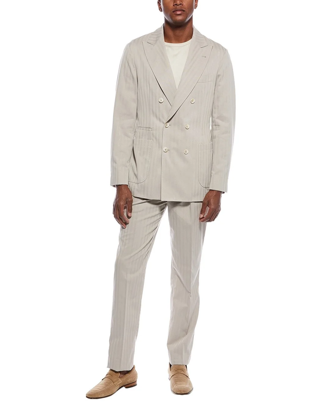 - About the brand: Hailed for its beautifully-crafted cashmere pieces, Brunello Cucinelli was named GQ's Designer of the Year in 2021. With attention to craftsmanship and sustainability, the company exemplifies Italian luxury. - Please note: Size selections are European. For US conversions, please reference the size chart. - Color/pattern: beige - Blazer: - Approximately 29in from shoulder to hem - Design details: peak lapel, and front pockets - Double-button closure - Pant: - Inseam approximately 31in - Design details: belt loops, and side pockets - Zip fly with slide tab closure - Model is 6'2 and is wearing a size 48. Measurements may vary slightly by size. - 85% cotton, 15% silk - Lining: 100% cupro - Dry clean only - Made in Italy - Our products are 100% genuine. In some cases we purchase merchandise from trusted independent suppliers and not directly from the brand owner. In all cases we stand by the authenticity of every product sold on our site.