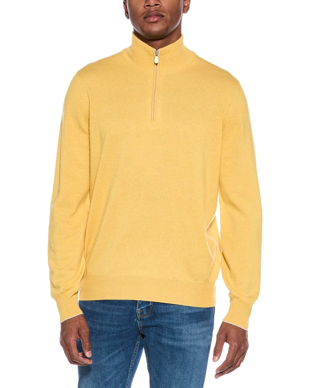 - About the brand: Hailed for its beautifully-crafted cashmere pieces, Brunello Cucinelli was named GQ's Designer of the Year in 2021. With attention to craftsmanship and sustainability, the company exemplifies Italian luxury. - Cashmere 1/4-Zip Mock Neck Sweater in yellow - Please note: Size selections are European. For US conversions, please reference the size chart. - Approximately 28in from shoulder to hem - Model is 6'2 and is wearing a size 50. Measurements may vary slightly by size. - 1/4-zip closure - 100% cashmere - Hand wash - Made in Italy - Our products are 100% genuine. In some cases we purchase merchandise from trusted independent suppliers and not directly from the brand owner. In all cases we stand by the authenticity of every product sold on our site.