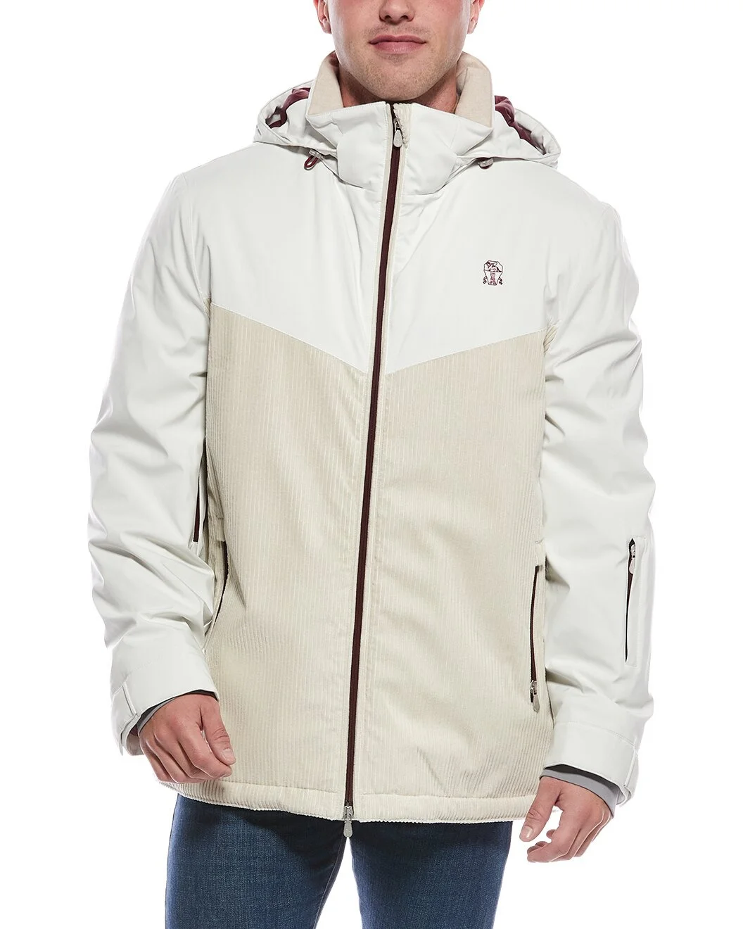 - About the brand: Hailed for its beautifully-crafted cashmere pieces, Brunello Cucinelli was named GQ's Designer of the Year in 2021. With attention to craftsmanship and sustainability, the company exemplifies Italian luxury. - Cashmere-Blend Corduroy Down Coat in white and beige with zippered pocket at left sleeve, two zippered front pockets, zippered underarm vents, removable hood, and quilted lining - Please note: Size selections are European. For US conversions, please reference the size chart. - Approximately 29in from shoulder to hem - Model is 6'2.5 and is wearing a size large. Measurements may vary slightly by size. - Zipper closure - Shell: 84% polyester, 16% polyurethane - Combo: 91% cotton, 9% cashmere - Lining: 100% nylon - Fill: 100% polyester - Dry clean only - Made in Italy - Our products are 100% genuine. In some cases we purchase merchandise from trusted independent suppliers and not directly from the brand owner. In all cases we stand by the authenticity of every product sold on our site. - WARNING: - CA Residents - Prop 65