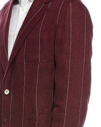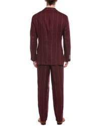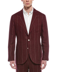 - About the brand: Hailed for its beautifully-crafted cashmere pieces, Brunello Cucinelli was named GQ's Designer of the Year in 2021. With attention to craftsmanship and sustainability, the company exemplifies Italian luxury. - This item tends to run large (based on Member feedback). We recommend sizing down for your best fit. - Please note: Size selections are European. For US conversions, please reference the size chart. - Color/pattern: red stripe - Jacket: - Approximately 32.5in from shoulder to hem - Design details: notched lapel, left chest pocket, three front pockets, button accents at cuffs and side vents at back hem - Button front - Pant: - Design details: belt loops, pleated front and four-pocket styling - Zip fly with button closure - Unfinished hem for easy tailoring - Model is 6'0 and is wearing a size 48. Measurements may vary slightly by size. - Shell: 100% linen - Jacket Lining: 100% cupro - Pant Lining: 100% cotton - Dry clean only - Made in Italy - Our products are 100% genuine. In some cases we purchase merchandise from trusted independent suppliers and not directly from the brand owner. In all cases we stand by the authenticity of every product sold on our site.