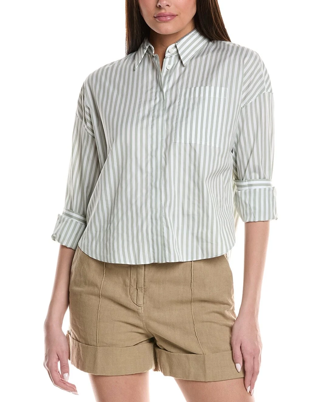 - About the brand: Hailed for its beautifully-crafted cashmere pieces, Brunello Cucinelli was named GQ's Designer of the Year in 2021. With attention to craftsmanship and sustainability, the company exemplifies Italian luxury. - Silk-Blend Shirt in green/white with beaded collar, chest pocket and button cuffs - Approximately 27in from shoulder to hem - Model is 5'11 and is wearing a size small. Measurements may vary slightly by size. - Button front - 81% cotton, 19% silk - Hand wash - Made in Italy - Our products are 100% genuine. In some cases we purchase merchandise from trusted independent suppliers and not directly from the brand owner. In all cases we stand by the authenticity of every product sold on our site.