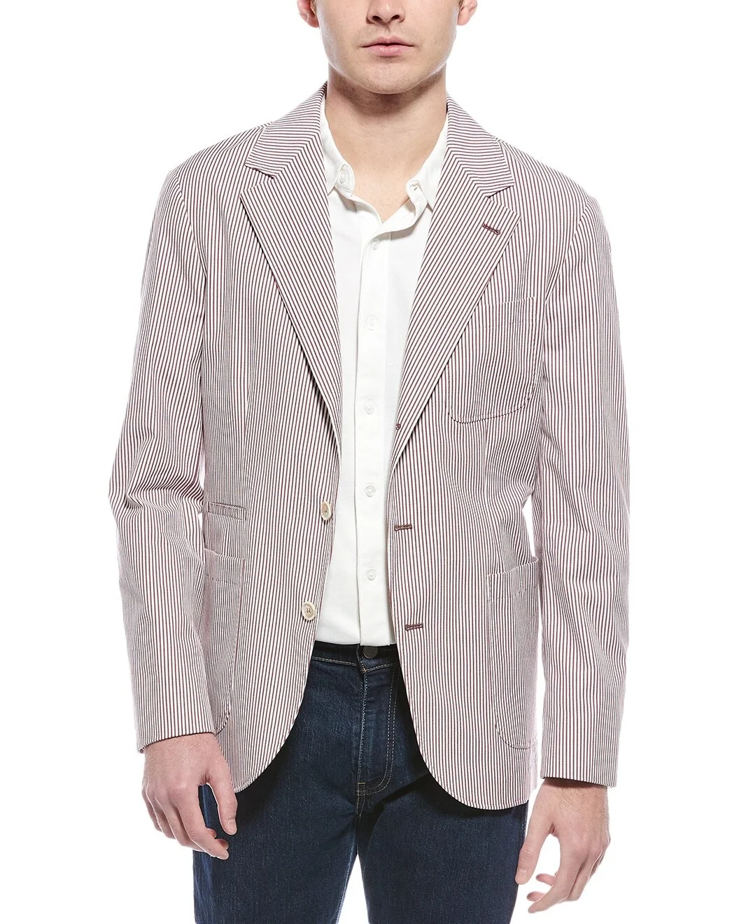 - About the brand: Hailed for its beautifully-crafted cashmere pieces, Brunello Cucinelli was named GQ's Designer of the Year in 2021. With attention to craftsmanship and sustainability, the company exemplifies Italian luxury. - Stripe Blazer in red with notch lapel, left chest pocket, three front pockets, and side vents at hem - Please note: Size selections are European. For US conversions, please reference the size chart. - Approximately 29in from shoulder to hem - Model is 6'2 and is wearing a size 50. Measurements may vary slightly by size. - Three-button closure - Shell: 98% cotton, 2% elastane - Lining: 100% cupro - Dry clean only - Made in Italy - Our products are 100% genuine. In some cases we purchase merchandise from trusted independent suppliers and not directly from the brand owner. In all cases we stand by the authenticity of every product sold on our site.