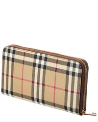 - About the brand: Iconic patterns, materials and silhouettes have made Burberry a coveted luxury staple since 1856. From waterproof, patented gabardine fabric to the unmistakable vintage check and the more modern monogram pattern, Burberry boasts undeniably British influence with timeless appeal. - Check E-Canvas Zip Around Wallet in archive beige/briar brown check E-Canvas and gold-tone hardware - Interior design details: leather lining, zippered pocket, card slots, bill compartments - Measures 8in wide x 4.5in high x 1in deep - Zipper closure - Please note: All measurements were taken by hand and are approximate; slight variations may occur. - Our products are 100% genuine. In some cases we purchase merchandise from trusted independent suppliers and not directly from the brand owner. In all cases we stand by the authenticity of every product sold on our site.