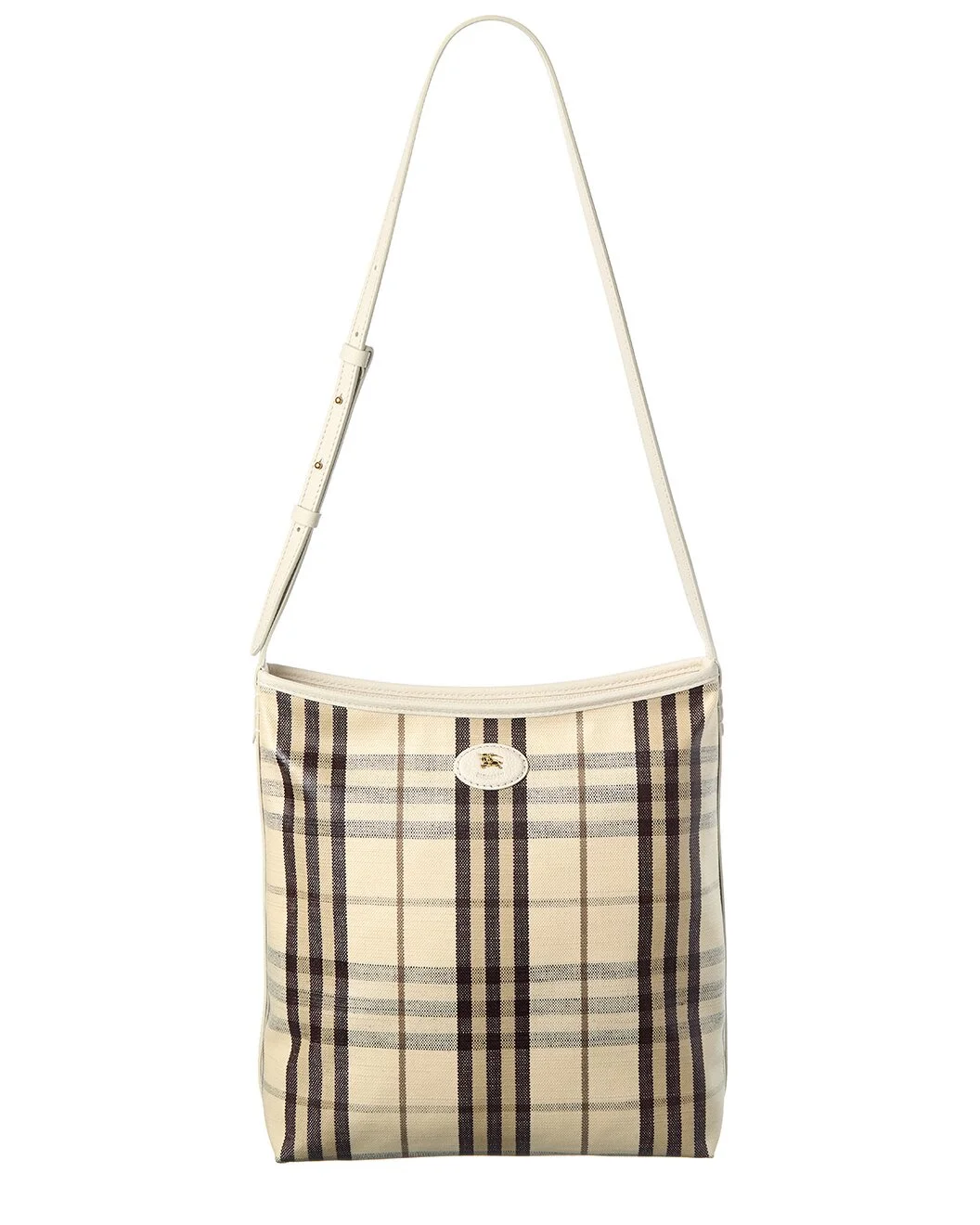 - About the brand: Iconic patterns, materials and silhouettes have made Burberry a coveted luxury staple since 1856. From waterproof, patented gabardine fabric to the unmistakable vintage check and the more modern monogram pattern, Burberry boasts undeniably British influence with timeless appeal. - Made in Italy - Highlands Small Check Canvas & Leather Tote in light beige check canvas and leather with gold-tone hardware and logo patch - Interior design details: canvas interior - Measures 11.2in wide x 12.2in high x 4.5in deep - Adjustable shoulder strap drops 20in - Zipper closure - Please note: All measurements were taken by hand and are approximate; slight variations may occur. - Our products are 100% genuine. In some cases we purchase merchandise from trusted independent suppliers and not directly from the brand owner. In all cases we stand by the authenticity of every product sold on our site.