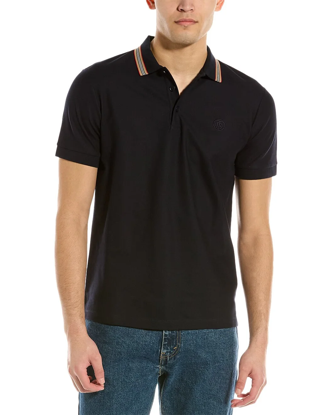 - About the brand: Iconic patterns, materials and silhouettes have made Burberry a coveted luxury staple since 1856. From waterproof, patented gabardine fabric to the unmistakable vintage check and the more modern monogram pattern, Burberry boasts undeniably British influence with timeless appeal. - Icon Stripe Collar Polo Shirt in coal blue with printed spread collar and embroidered logo at chest - Approximately 29in from shoulder to hem - Model is 6'1.5 and is wearing a size extra large. Measurements may vary slightly by size. - Button placket - 100% cotton - Machine wash - Our products are 100% genuine. In some cases we purchase merchandise from trusted independent suppliers and not directly from the brand owner. In all cases we stand by the authenticity of every product sold on our site.
