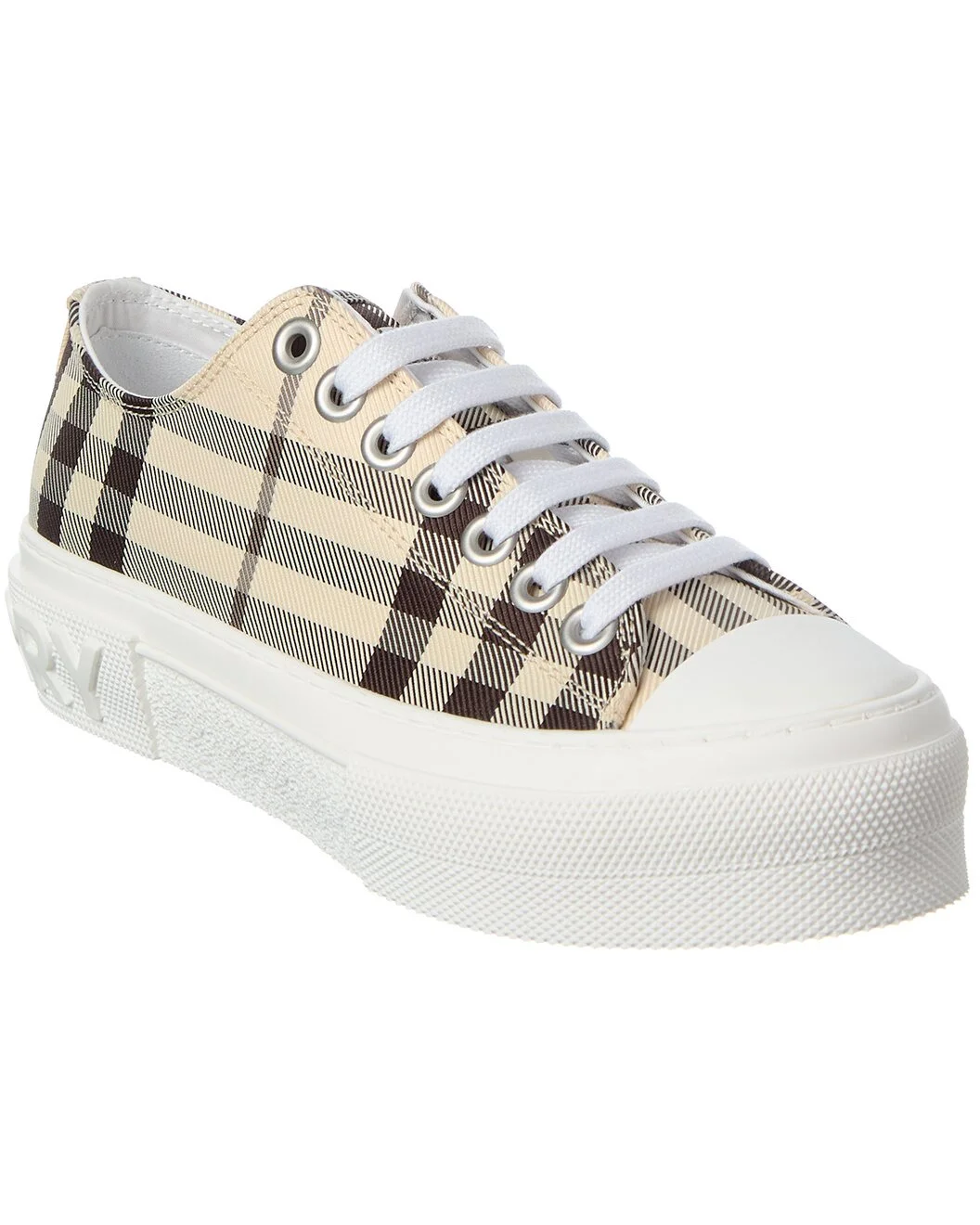 - About the brand: Iconic patterns, materials and silhouettes have made Burberry a coveted luxury staple since 1856. From waterproof, patented gabardine fabric to the unmistakable vintage check and the more modern monogram pattern, Burberry boasts undeniably British influence with timeless appeal. - Please note: Size selections are European. For US conversions, please reference size chart. - Made in Italy - Jack Check Canvas Sneaker in beige check canvas and silver-tone hardware with logo graphic at tongue - Lace-up closure - Lightly padded leather insole - Rubber sole with traction - 1.5in platform - Please note: All measurements are approximate and were taken from a size 37; slight variations may occur. - Our products are 100% genuine. In some cases we purchase merchandise from trusted independent suppliers and not directly from the brand owner. In all cases we stand by the authenticity of every product sold on our site.