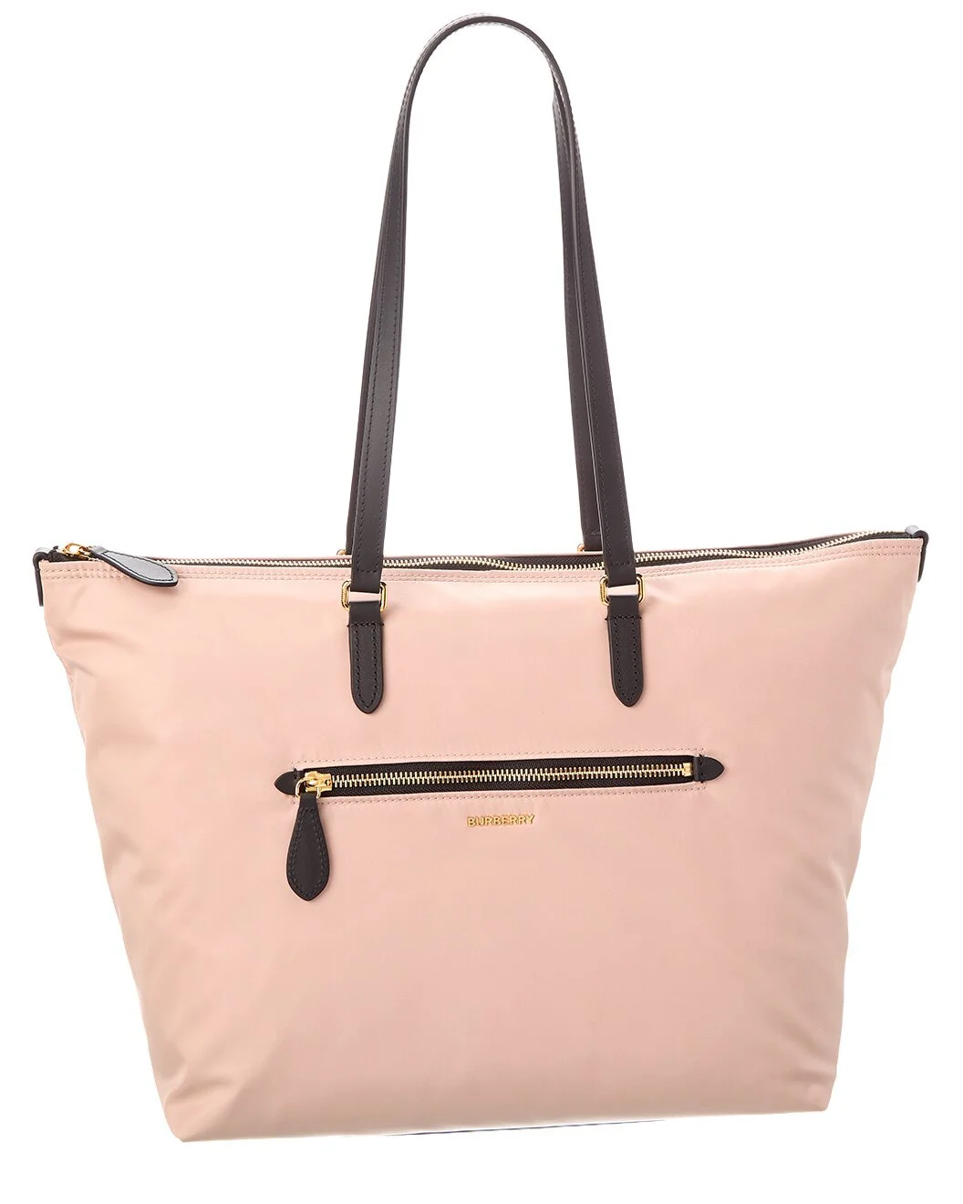 - About the brand: Iconic patterns, materials and silhouettes have made Burberry a coveted luxury staple since 1856. From waterproof, patented gabardine fabric to the unmistakable vintage check and the more modern monogram pattern, Burberry boasts undeniably British influence with timeless appeal. - Large Zip Nylon & Leather Tote in rose beige nylon and black leather and gold-tone hardware with zippered pocket - Interior design details: check nylon lining, zippered pocket - Measures 17.5in wide x 11.5in high x 6.5in deep - Shoulder straps drop 12in - Zipper closure - Please note: All measurements were taken by hand and are approximate; slight variations may occur. - Our products are 100% genuine. In some cases we purchase merchandise from trusted independent suppliers and not directly from the brand owner. In all cases we stand by the authenticity of every product sold on our site.