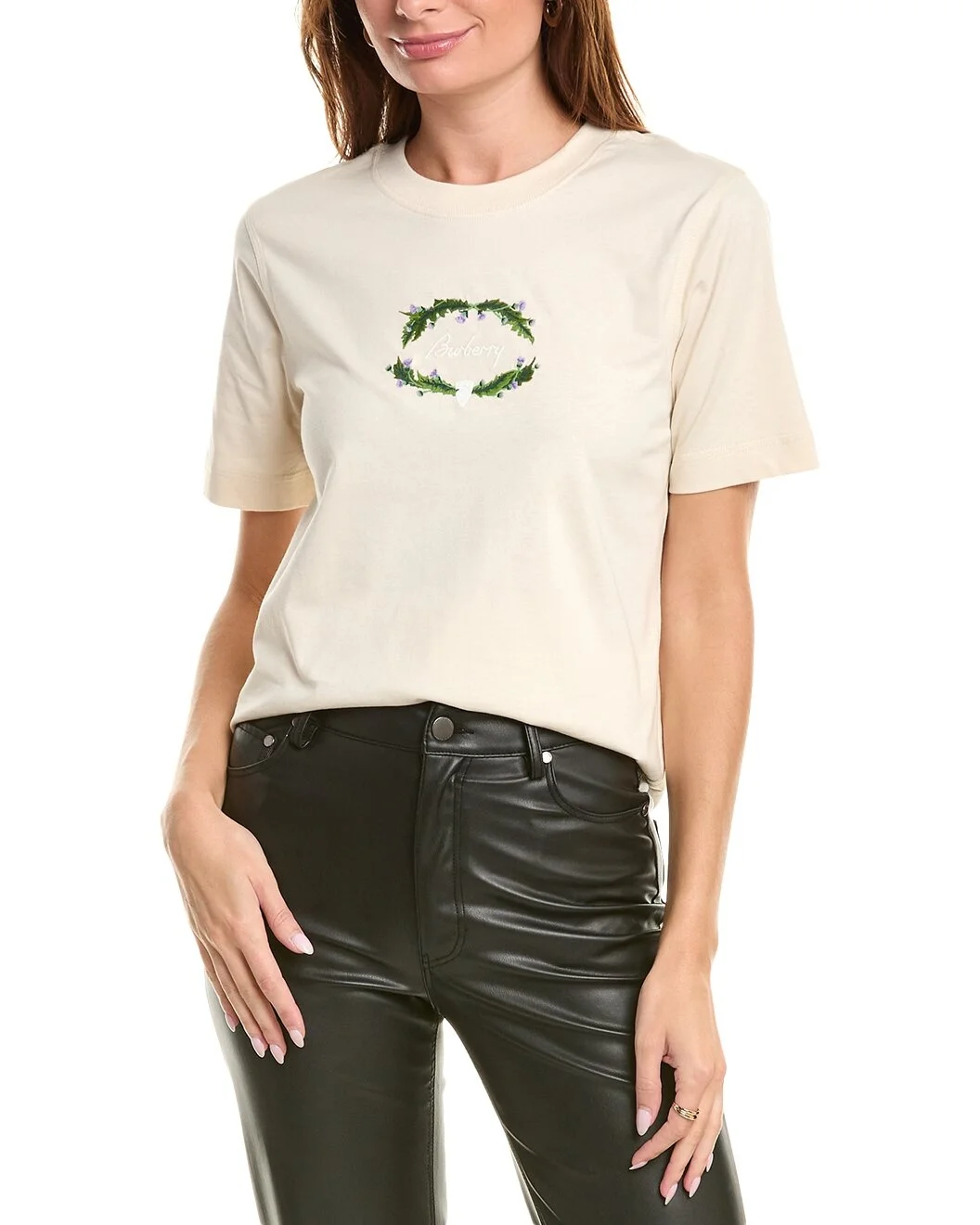 - About the brand: Iconic patterns, materials and silhouettes have made Burberry a coveted luxury staple since 1856. From waterproof, patented gabardine fabric to the unmistakable vintage check and the more modern monogram pattern, Burberry boasts undeniably British influence with timeless appeal. - Thistle Logo T-Shirt in tundra with crewneck and logo embroidery - Approximately 25in from shoulder to hem - Model is 5'10 and is wearing a size small. Measurements may vary slightly by size. - 100% cotton - Machine wash - Our products are 100% genuine. In some cases we purchase merchandise from trusted independent suppliers and not directly from the brand owner. In all cases we stand by the authenticity of every product sold on our site.