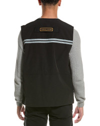 - About the brand: Canada Goose. Function-first apparel with a nod to adventure. - Canmore Vest in black with V-neck, chest pocket with patch logo, two front zippered pockets, reflective striping and zippered back pocket - Approximately 27.5in from shoulder to hem - Model is 6'2.5 and is wearing a size medium. Measurements may vary slightly by size. - Zipper front - Lightweight - 84% polyester, 16% cotton - Lining: 100% polyester - Machine wash - Made in Canada - Our products are 100% genuine. In some cases we purchase merchandise from trusted independent suppliers and not directly from the brand owner. In all cases we stand by the authenticity of every product sold on our site.