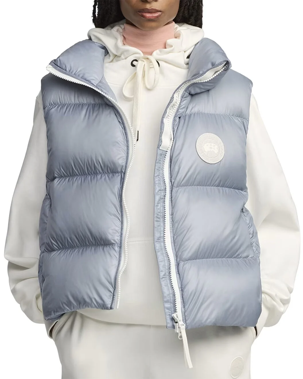 - About the brand: Canada Goose. Function-first apparel with a nod to adventure. - Cypress Puffer Down Vest in light ozone blue with quilted construction, stand collar, patch logo at chest, two front zippered pockets and inner drawcord at hem - Approximately 24in from shoulder to hem - Model is 5'10 and is wearing a size small. Measurements may vary slightly by size. - Zipper front - Lightweight - Shell & Lining: 100% polyamide - Fill: 90% duck down, 10% feather - Machine wash - Made in Canada - Our products are 100% genuine. In some cases we purchase merchandise from trusted independent suppliers and not directly from the brand owner. In all cases we stand by the authenticity of every product sold on our site.