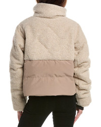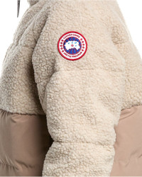 - About the brand: Canada Goose. Function-first apparel with a nod to adventure. - Elora Wool-Blend Puffer Jacket in beige with quilted construction, stand collar, two front zippered pockets, patch logo at sleeve, ribbed inner cuffs and inner drawcord at hem - Approximately 25in from shoulder to hem - Model is 5'10 and is wearing a size small. Measurements may vary slightly by size. - Zipper front - Medium weight - 84% polyester, 16% cotton - Contrast: 56% recycled wool, 35% polyester, 5% polyamide, 4% other - Back: 100% lyocell - Lining: 100% polyamide / Fill: 80% duck down, 20% feathers - Fill: 80% duck down, 20% feathers - Dry clean only - Made in Canada - Our products are 100% genuine. In some cases we purchase merchandise from trusted independent suppliers and not directly from the brand owner. In all cases we stand by the authenticity of every product sold on our site.