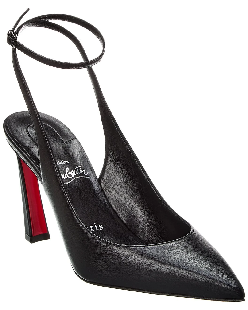 - About the brand: Christian Louboutin. Elegance, technical proficiency, and that signature red sole. - Please note: Size selections are European. For US conversions, please reference size chart. - Based on feedback from Members, this brand typically runs small and narrow. We suggest sizing up a half to full size for most styles. Sizing up won't increase the width of the toe box, however. - Made in Italy - Condora Strap 85 Leather Pump in black leather with black hardware - Adjustable ankle strap with buckle closure - Lightly padded leather insole - Smooth leather sole - 3.25in heel - Please note: All measurements are approximate and were taken from a size 37; slight variations may occur. - Our products are 100% genuine. In some cases we purchase merchandise from trusted independent suppliers and not directly from the brand owner. In all cases we stand by the authenticity of every product sold on our site.