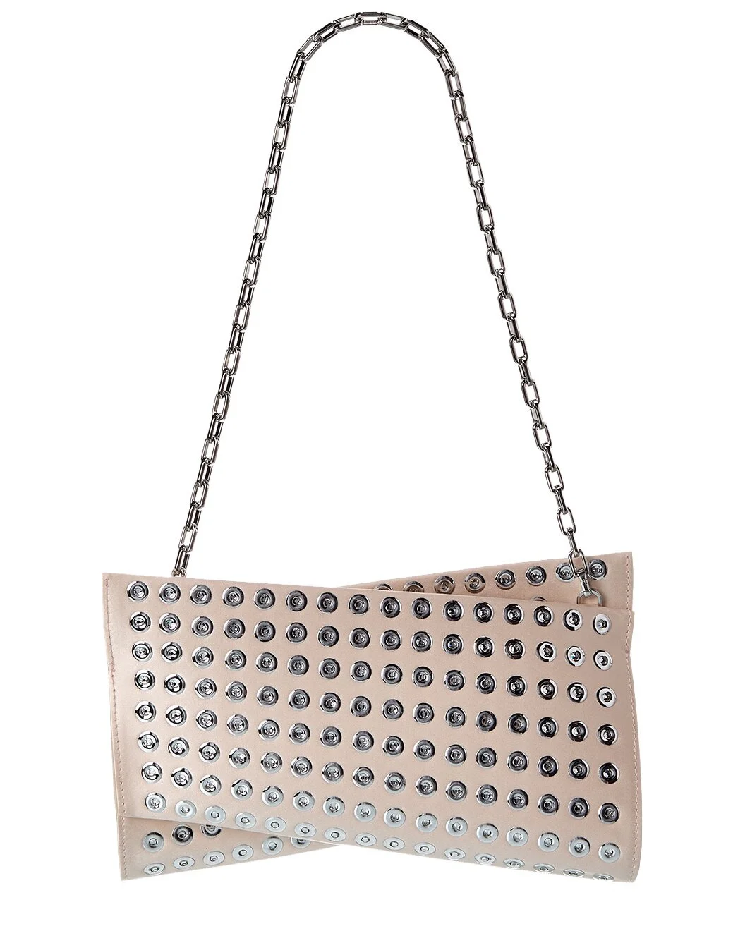 - About the brand: Christian Louboutin. Elegance, technical proficiency, and that signature red sole. - Made in Italy - Loubitwist Satin Clutch in leche satin and silver-tone hardware with rhinestone embellishments and chain strap - Interior design details: signature red fabric lining, leather card slots - Measures 10in wide x 6.5in high x 2in deep - Shoulder strap drops 13in - Zipper closure - Please note: All measurements were taken by hand and are approximate; slight variations may occur. - Our products are 100% genuine. In some cases we purchase merchandise from trusted independent suppliers and not directly from the brand owner. In all cases we stand by the authenticity of every product sold on our site.