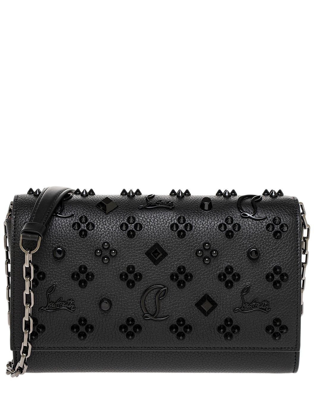 - About the brand: Christian Louboutin. Elegance, technical proficiency, and that signature red sole. - Made in Italy - Color/material: black leather - Design details: black-tone and dark grey-tone hardware, crafted in luxurious grained leather, features Loubinthesky spikes and CL Monograms in black-toned hardware, removable dark silver-tone chain strap - Interior design details: Card slots, slip pocket, bill compartment, zip compartment - Measures 9in wide x 6.5in high x 2in deep - Shoulder strap drops 21.5in - Magnetic snap closure - Please note: All measurements were taken by hand and are approximate; slight variations may occur. - Our products are 100% genuine. In some cases we purchase merchandise from trusted independent suppliers and not directly from the brand owner. In all cases we stand by the authenticity of every product sold on our site.